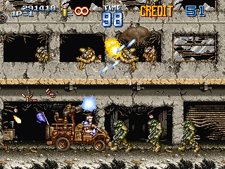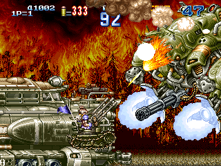 Heavy metal synth tracks complement the action perfectly, though you’ll be hard-pressed to hear them over the din of the mayhem on screen. A particular highlight is the repeating boss theme, all eerie foreboding that gets the pulse pounding during the game’s tougher tests. Several of the tracks are remixed or reworked versions of tunes from Nazca Corporation’s earlier effort, Air Duel. The sound effects are much better and more varied than the original GunForce, with some (notably the Wilhelm Scream-esque enemy cry) being later used in the original Metal Slug.