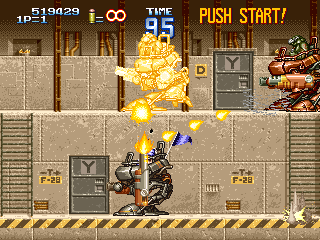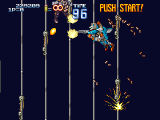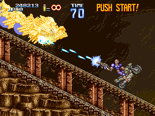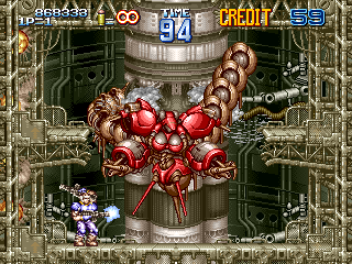 The first stage sees you fight your way forward on the back of a runaway locomotive, before taking down the insectoid, minigun toting robotic boss. Blasting your way through mechas as you push forward into an enemy base in level two, you’re faced with a steampunk tower on tank treads. Stage three takes the game vertical, asking you to climb chains while taking on hordes of foes, and then hop onto a motorcycle while you’re pursued by a crab-like robot, in a real highlight of the game. A post-apocalyptic ruined city forms the base of the penultimate level, before taking you skyward in an elevator for a face-off with a reptilian, bomb-spitting machine. Jumping into a ship at the start of the final stage, the game briefly turns into a shoot-em-up as you avoid missiles and blast a spacecraft to gain entrance. You’re instantly beset by a raft of extra-terrestrials, clearly influenced by H. R. Giger’s work on the Alien movies. The final boss is an unsettling centipede-like robot that dives at you as you work your way up a missile shaft.