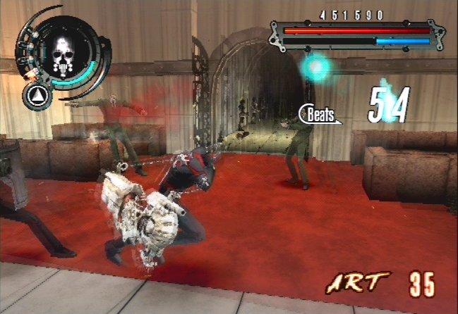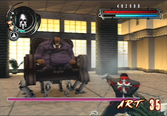 Aside from the two new characters, Gungrave has been changed quite a bit. The general idea remains the same; run through stages mowing down wave after wave of enemies, but now you have a few more ways to do so. One thing that’s been tweaked heavily are the close-range attacks. What was a single-hit anti-siege attack in Gungrave now functions as fully fledged melee attacks that can be linked together in Overdose. Grave can now perform a 3 hit combo with his coffin, the last hit capable of being charged, while Juji slices up enemies and Billy swings his guitar about using telekinesis. Also new to the game are charged shots. Grave and Billy can charge their ranged attacks to unleash a much more powerful shot. The longer you charge, the more shots will be unleashed once you release the button. These attacks are especially good against bosses. Juji can’t charge his shot, but he can charge his melee attacks in the same manner to unleash a flurry of sword waves that slice up anything in front of him. All characters are also set to run without holding down a button, which speeds up the game a tiny bit. The addition of motion blur and more impressively destructible environments also add to the chaotic action movie flair.