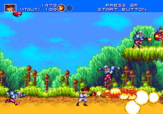 Gunstar Heroes recently received a re-release of sorts on the PS2 with the Sega Ages Treasure Box. The port is excellent, with many display options available if you’re a stickler, including progressive scan mode, true low-res, and a scanline mode. Only the sound suffers a bit due to the notoriously difficult to emulate Mega Drive sound chip. There are also extensive galleries with pictures of all versions from all territories, including full manual scans and a lot of cool concept art for Gunstar Heroes. You can also unlock the original design document, which has all kinds of trivia. (Just beat the game, and make sure you’re playing the “JAPAN” version and not the “OVERSEAS” version.) Two initially planned names included “Lunatic Gunstar” and “Blade Gunner”; the double flame weapon was initially supposed to be a dragon; and each gem was supposed to grant extra powers when collected and equipped. The ROM has also been released commercially in the US for the Nintendo Wii Virtual Console.
