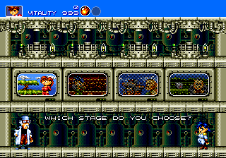 There is also a decent bit of variety throughout the stages; many of which have been done before in one way or another, though never quite so well. The second level, with its breakneck magnetic mine car ride and incredible boss fight, with the now-famous Seven Force, is something that everyone simply needs to experience. It’s a gigantic robot with the ability to transform into seven different mechas, such as a phoenix or a huge revolver. Black’s palace is represented as a board game, with each square containing some kind of brief, unique challenges. In one, you need to destroy a vehicle as fast as possible. Another is an obstacle course. Yet another is a fight against a tiny robot a fraction of your size that can still toss you across the screen. One square totally bans weapons. Lots of them are completely crazy and just go to show off some of the fancy effects that Treasure decided to stick in. The horizontal shoot ’em up stage that takes place later on is also quite fun and well designed enough to be its own game. The final stage begins with all of the bosses watching your attack on a gigantic television screen. After you fight through them, one by one, they’re called out of the control room and into battle, before you finally storm in there yourself to confront the last boss. Every element is so well crafted that it seems much larger than its seven stages. You can also pick the order in which to tackle the first four stages, and beating each one will extend your starting HP by 20 points.