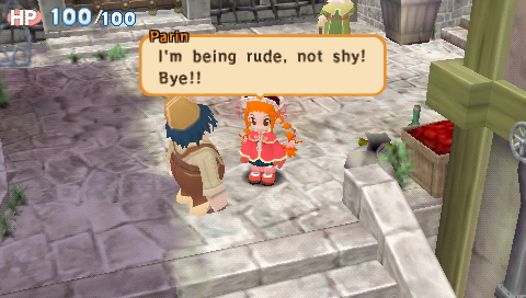 Parin, too, is a charming heroine. The town is apparently bigger than you can actually explore, but Parin won’t go there because she insists it looks boring. Look at a trash can, and she concedes that she has an irrational urge to destroy it. Hit the pause button and a little balloon that says “Wait up!” pops up above her. She speaks in a humorously flat tone, even when excited or exasperated. The interactions with the adults are prove for some amusing dialogue, except for a miner who repeatedly asking Parin out on dates. While she rejects him and acts appropriately disgusted, it’s still more creepy than funny.