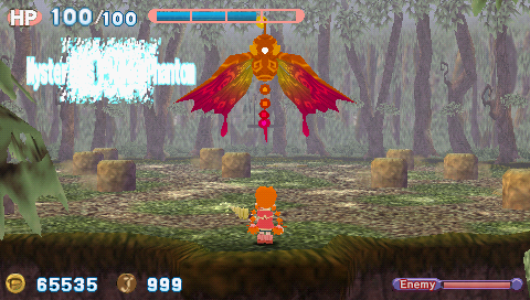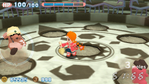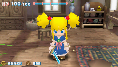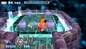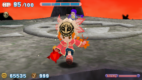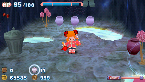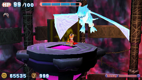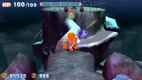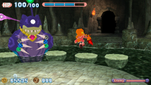 Gurumin is a change of pace for Falcom, a company widely known for RPGs. While you gather money and there is some equipment to purchase, it’s really more of a 3D action-platformer, the kind that would seem perfectly at home in the 32/64-bit console era. There is a Super Mario World-type map screen where you can visit levels. There are six types of stages, usually with two or three levels, as well as a boss battle. Each stage also has an alternate, optional variation, which are played in reverse with altered enemy placement and other minor changes.