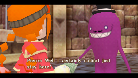 Gurumin prides itself in being incredibly adorable. The character models are simplistic but colorful and expressive. The monsters are an oddball group, consisting of a French blob with a monocle, mustache and a particular taste for the pretentious; a funky breakdancing ghost; and a gigantic Totoro-like cat with an impossibly deep voice. The phantoms, with their singular wide eyes, goofy smiles and overtly ordinate headgear, are similarly cute, despite technically being bad guys. Sometimes you can find them just frolicking around the stages, harmlessly, unless you want to be a jerk and ruin their fun by attacking. The bosses are just as amusing, if mostly because they can be found just hanging around, chilling, in various areas after you beat them. One of them is named Bob, probably the least imposing name for a boss in any video game. The soundtrack is atypical of Falcom’s typical synth-rock, with cutesier tracks that are more appropriate to the game’s silliness.