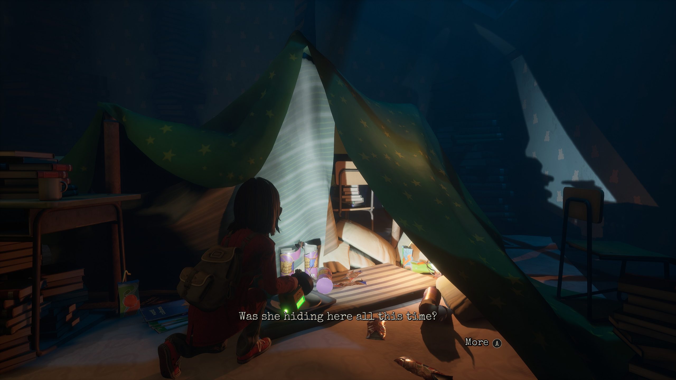 The game’s story is ultimately told through a combination of spoken dialog, journal entries, and environmental storytelling. Visual clues can hint at what was going on, such as the juice boxes, boxes of cookies and chocolate-bar wrappers found in the vents. Do they mean Emily was hiding there in terror, storing junk food for sustenance? That would explain why her fingers and clothes have what appears to be mud or maybe chocolate on them. A tent with magazines and food in one of the school’s rooms leads Sally to speculate that this might have been a place where Emily hid out to escape her tormentors, or the monsters.
