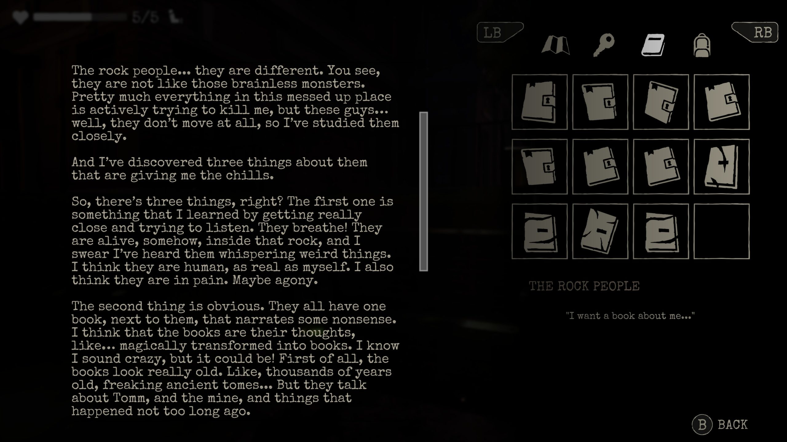 Throughout the game, you encounter journal entries, as well as people who’ve been turned to stone, all of whom appear to have worked for the corrupt mining company, Tomm. While journal entries are a super common cliche in horror games (Tormented Souls in particular relied heavily on them to tell its backstory, which raised questions about why some of these characters even bothered to keep such meticulous and erudite journals), here, not only are they actually written at the education level one might expect from each person, there’s also an explanation provided by one of the journals. They appear to be the crystallized thoughts of various people, having been changed into journal form without the person having actually written anything. Some of them being the person’s thoughts shortly before whatever happened to them.