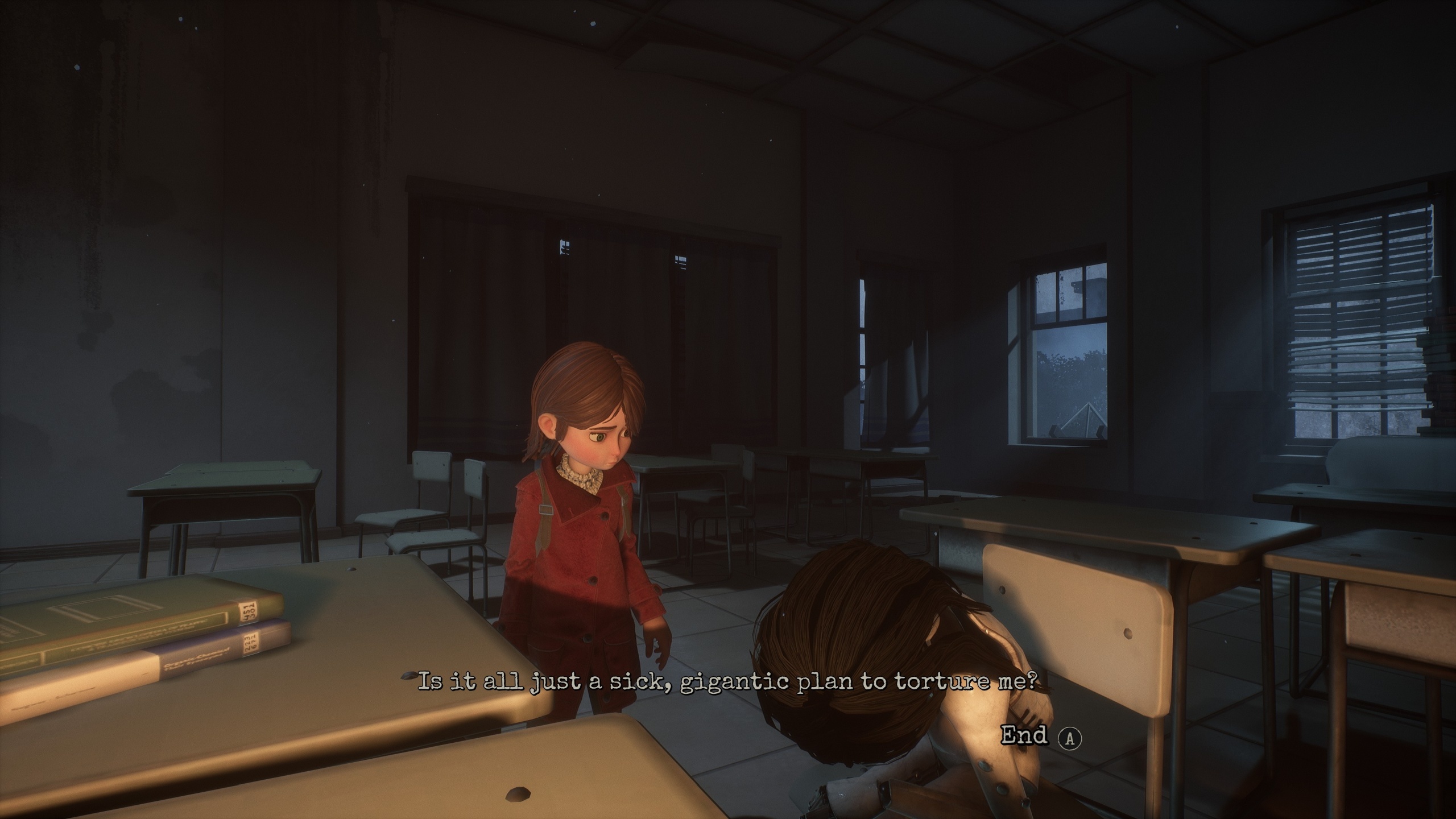 The game opens with a disclaimer, saying that it contains depictions of bullying, and if you need help, to contact a professional. Other games that use horror as metaphor for real world issues, such as The Missing: J. J. Macfield and the Island of Memories, have disclaimers as well, but a warning about depictions of bullying is pretty new.