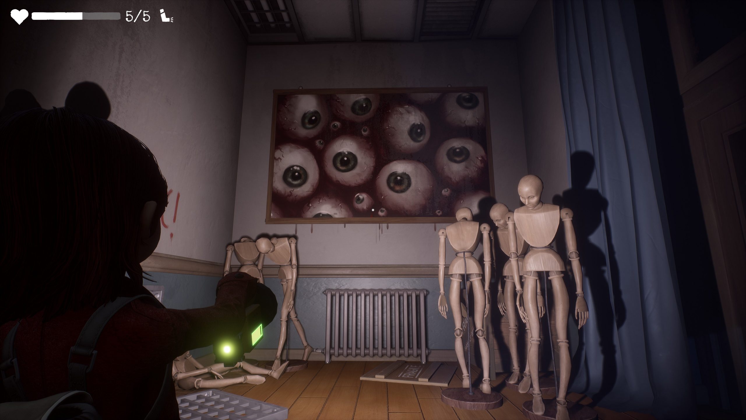 Sally starts out defenseless against the monsters, but eventually gains ways of fighting back, such as firing a powerful beam from her flashlight to destroy bulbous pustules on the monsters’ bodies. They can also be distracted by throwing soda cans that can be obtained infinitely from vending machines. You can one-shot them with a behind-the-back stealth kill with your flashlight, though it eats up one-third of your flashlight battery and if overused, can leave you in real danger. Naturally, there are batteries lying around to refill your flashlight. There are also inhalers to restore your health, indicating that perhaps Sally has asthma, which might also explain why she can only run for about three seconds before having to recover.