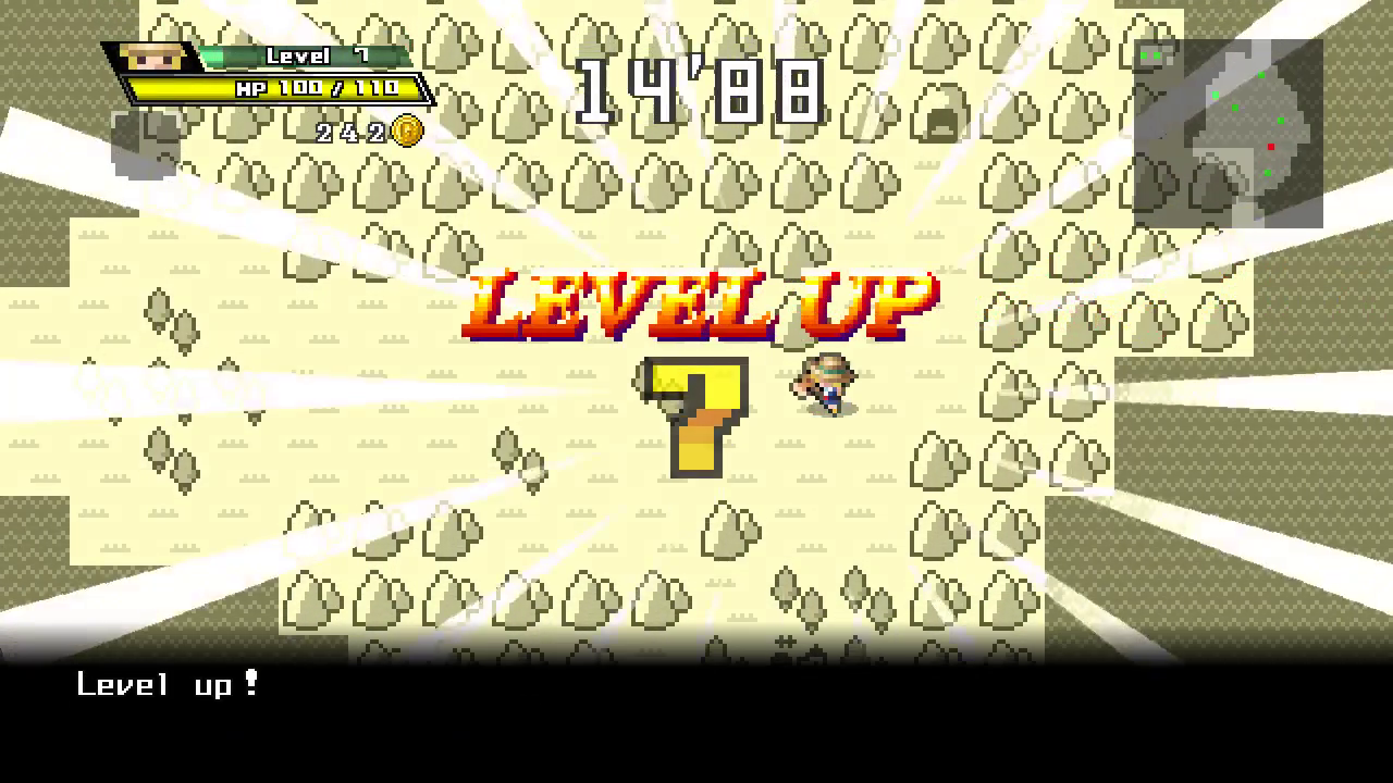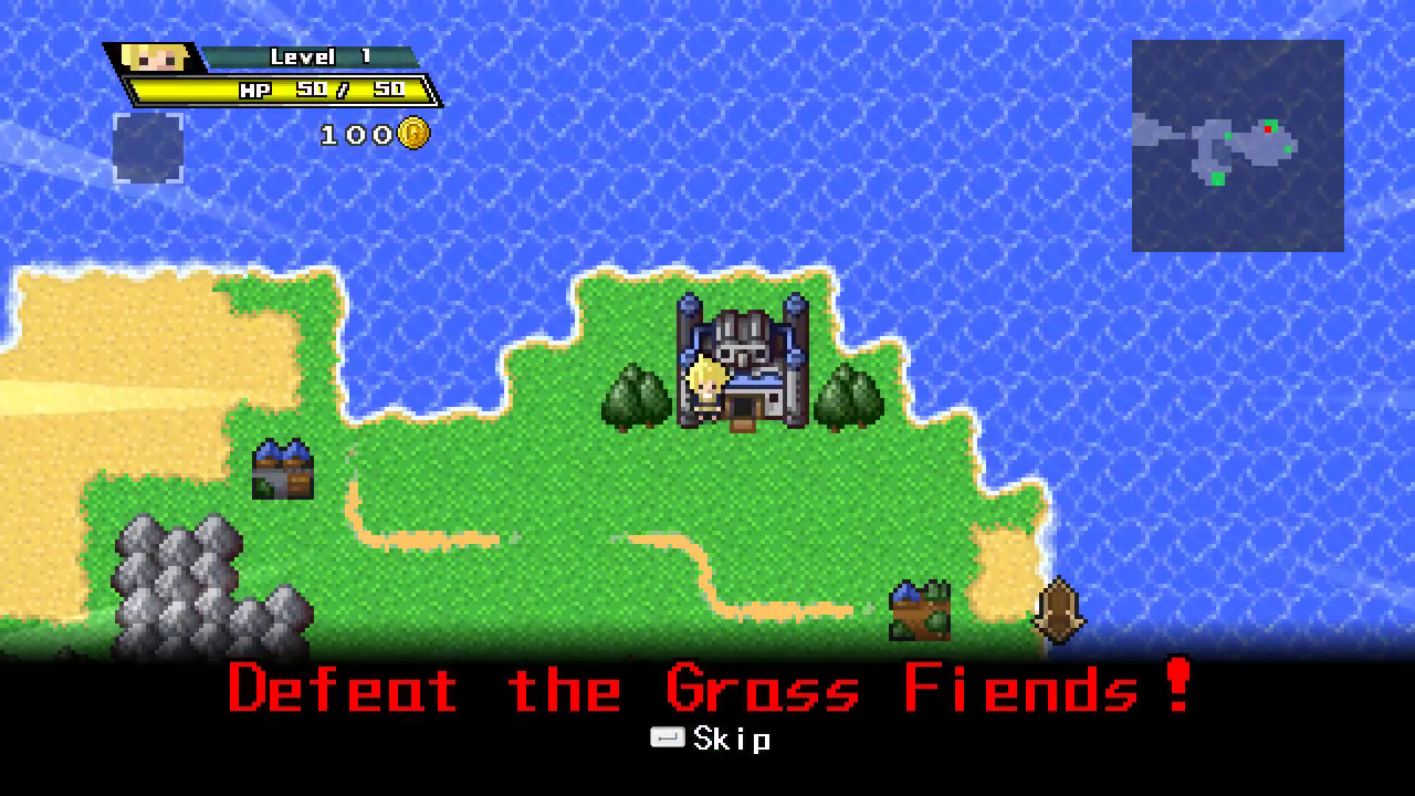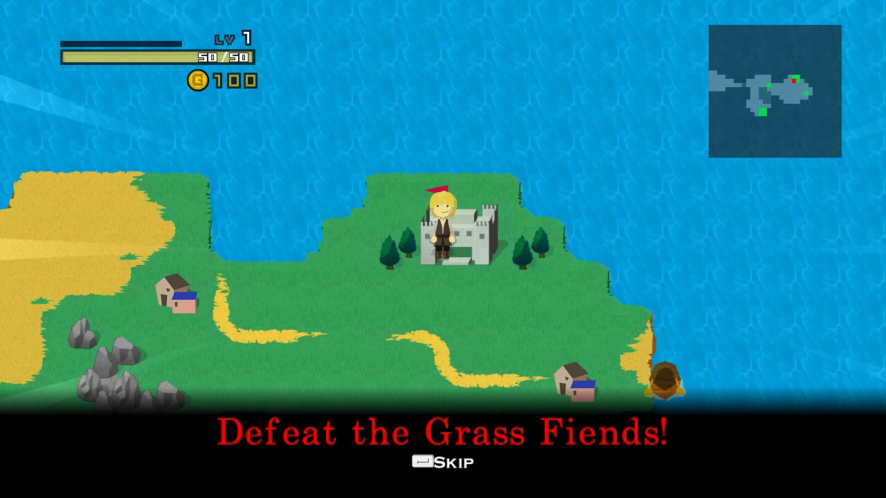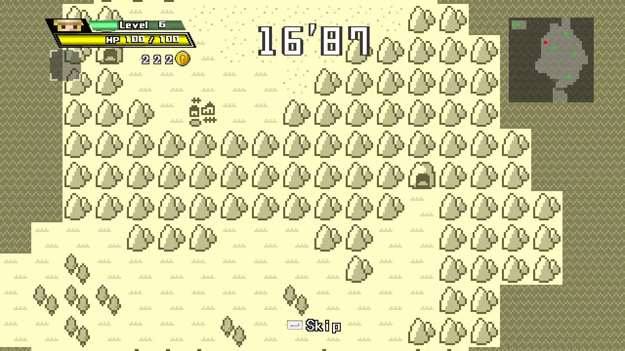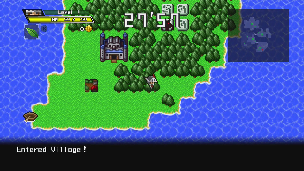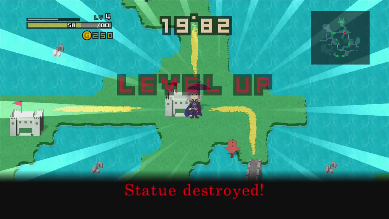 Your objective in almost every stage is to cross to the Evil Lord’s fortress and beat them before the timer runs out. You will have to level up to beat the boss, and the game will provide a flaming prompt saying “YOU > EVIL” after you reach a high enough level, although it is possible to beat the Evil Lord at a lower level with careful use of items and equipment. In most stages however, the true challenge is reaching the Evil Lord’s fortress in the first place. You’ll have to run side-quests to repair bridges, find holy grails, or locate mystical weapons like plastic fly swatters to overcome the Evil Lord’s special defences, all this while trying to find enough cash to buy the equipment and stay afloat in your debt to the Time Goddess. In some cases, resetting time will also reset certain progress, forcing you to do the bulk of the work inside of thirty seconds after all!
