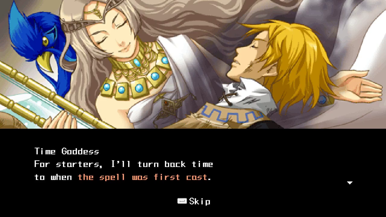 Knight 30 represents an odd turn in Half-Minute Hero‘s story. While the game had previously handled drama with an infrequent hand, Knight 30 opens by announcing that the Time Goddess has been (comically) captured and (not so comically) murdered, leading to 100 years of apocalyptic darkness. We turn to two wanderers, out to arrange “a miracle.”