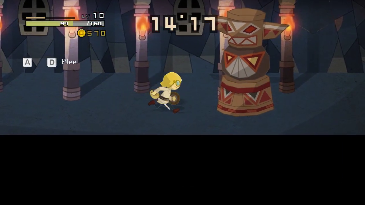 Inside towns, the timer is frozen on Normal difficulty, though not on Hard. Towns feature the usual NPC gossip, alongside restaurants to refill your health, herb shops for portable healing, and equipment shops. The equipment is the real prize, since any equipment you buy will be carried over into later stages, though they cannot be brought back to earlier stages. Towns also play home to the Goddess Statues. To keep the thirty-second doomsday at bay, you must pay off the Time Goddess at these statues to restart the timer. The price starts low, but increase with each payment, making it harder and harder to keep going.
