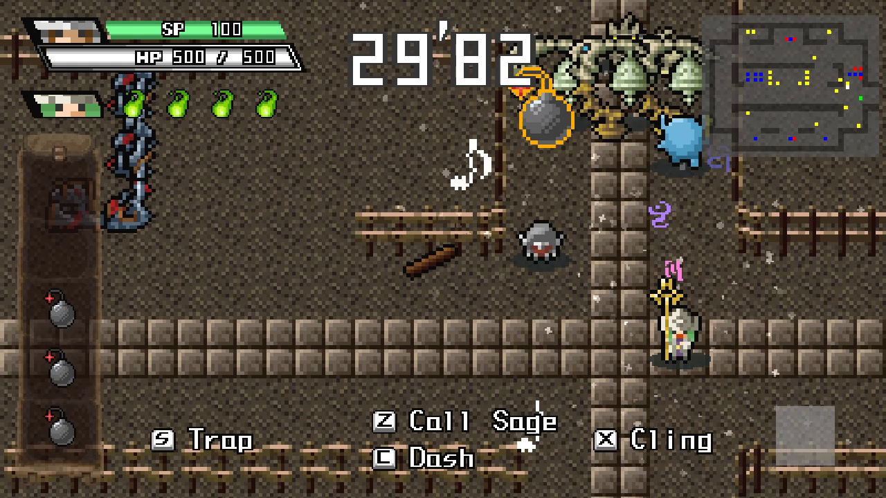 Unlike other modes, score matters in Knight 30, as it converts to EXP. Knight can also ration his nights by hour to recover stamina or construct traps. The traps range from distracting scarecrows, portable walls and damaging bombs. Because of the way trap production levels up, the system is unbalanced, making the end of the game exponentially easier than the start.