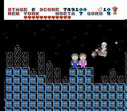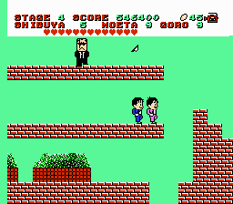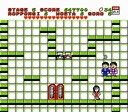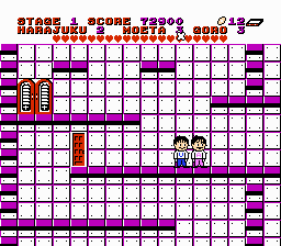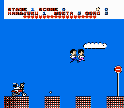In the Famicom game Hana no Star Kaidou, you take on the roles of two fictional musicians – Moeta Hatano and Goro Toyota – as they run around and try to become famous. Most of the locales are placed in Tokyo, even though some parts seem to be directly inspired by the Mushroom Kingdom, but the eventual goal is to reach New York City. To catch of the game is, you control both characters at the same, with a single D-pad. Conceptually this might not sound terrible – after all, the charming Famicom title Binary Land had the same basic idea. However, while that was a simple puzzle game, this is a side scrolling platform game.