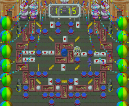 Hansha de Spark!, a 1997 Saturn exclusive and the final title of the short-lived developer known as Prism Inc., is an interesting attempt to twist the tried and true Bomberman formula into something a bit different. While the template is much the same here as its inspiration – defeat foes within a maze while avoiding your own attacks – Hansha de Spark! employs a more complex means of offense. With the A button, you can shoot a projectile that does almost nothing on its own, but becomes stronger whenever it bounces against angled walls placed throughout levels. A projectile that continues to reflect off of walls will increase in speed and grow in size until it hits a dead end and dissipates, taking anything it touches (including you) along with it. To aid in this, you also have the ability to rotate certain walls in order to change the direction shots will take when bouncing off of them. There are also power-ups to assist in your endeavors, such as a speed boost, a shield, and the ability to place down single-use walls anywhere you want.