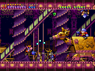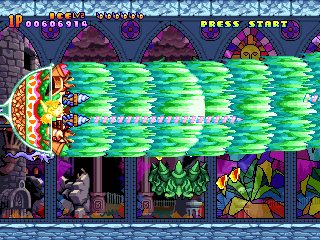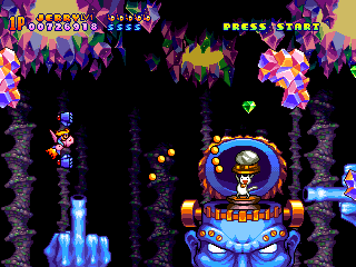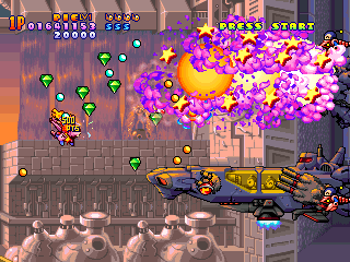Each weapon can be strengthened individually up to three times, although power-ups tend to be on the rare side. Getting killed will downgrade your current weapon by a level, but it’s possible to keep a strong arsenal in backup if you spread your power-ups properly. You’re also immediately resurrected after death, so you don’t need to worry about check points. You can continue right where you left off, up until stage four, when it starts sending you back to the beginning of the level when you run out of lives. Each of the six stages are relatively lengthy, usually taking about five minutes to clear.