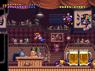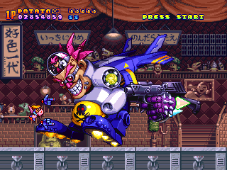 As with Parodius, Harmful Park is really defined by all of the details, whether they be strange enemies, inventive bullet patterns, or just plain wacky situations. One bad guy has a Jiffy Pop embedded in his chest, which he then explodes, unleashing a torrent of popcorn. Another set of enemies drink down gasoline and then breath of fire. Yet another is a gumball machine which sends gumballs bouncing erratically around the screen. Paratroopers fall from the sky, into a vat of chocolate, which then splashes up to try to kill you. Many of the artillery encampments are merely coin operated rides. The bats carry baseball bats. Certain enemies leave behind notes that say “aho” (jerk). And then there’s the giant robotic ape riding the cow train.