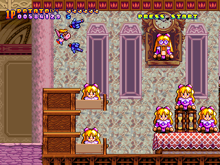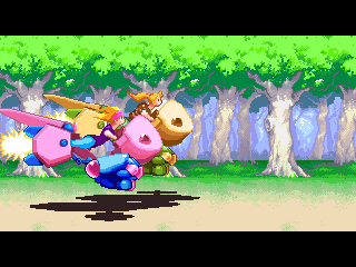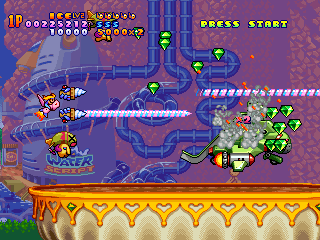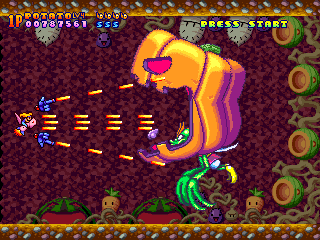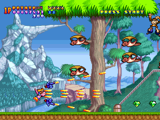 At any time, you can switch between four weapons: Potato, Ice Cream, Pie and Jerry (should be Jelly, but since the Japanese don’t distinguish between r’s and ‘l’s, we’ll forgive them.) The Potato gun is your standard rapid fire bullet weapon, while the Ice Cream is pretty similar to the Laser weapons from the Gradius games, firing a long, powerful stream of delicious destruction. The Pie weapons is slow, but travels at an arc and can cause great damage if they hit, while the Jerry weapon homes in on enemies on the screen, but it’s rather weak.