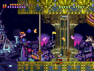 This level takes place at dusk, and features a gigantic roller coaster. Compared to the rest of the game, it isn’t quite as interesting, except for a strange, human-faced battleship and a drive-in movie theater.