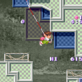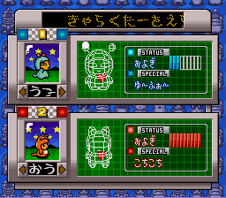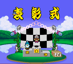 The race tracks are seen in an isometric perspective, and the options menu offers the interesting feature of toggling transparency for the graphic elements that overlap the track on and off. The visuals are unlike everything seen before or since in the series, but nonetheless quite beautiful and detailed (vaguely reminiscent of the console fantasy JRPGs of the time), to the point that the Hebereke characters with their gaudy colors and simple shapes seem a bit out of place. But there still are zany elements such as the UFO and the lake monster with Hebe’s head in the background of the victory screen.