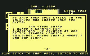 That is not to say that all changes from Seven Cities of Gold are for the worse. The diary entries are well-written and bring more personality to the game, while its smaller scope and focus on solving the mystery by searching for clues is a nice take on the adventure genre that doesn’t rely on weird, illogical puzzles. The replacement of random maps with randomizations of the location of stashes and the tomb might not be the most welcome change but it was probably the only way of introducing randomness to this kind of game (there’s an ongoing attempt at making a narrative-driven game set in a procedurally generated world with Ultima Ratio Regum but that is being developed for computers much more sophisticated than the Commodore 64).