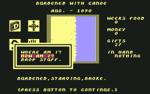 When you start playing Heart of Africa, your character arrives to Cairo in 1890. There it is possible to buy some helpful items in various different shops, pay for a ferry ticket and save the game. The ferry allows for quick travel between the port cities, which serve a similar purpose as Spain in Seven Cities of Gold – you go there if your resources are running out, you need cash (you’ll get a wire transfer if you explore enough of the continent) or gifts (this is how you pay for things outside of port cities), you get sick or just need to save your progress. They are the game’s save spots and of course you’ll often be quite far away from them when you need them most.