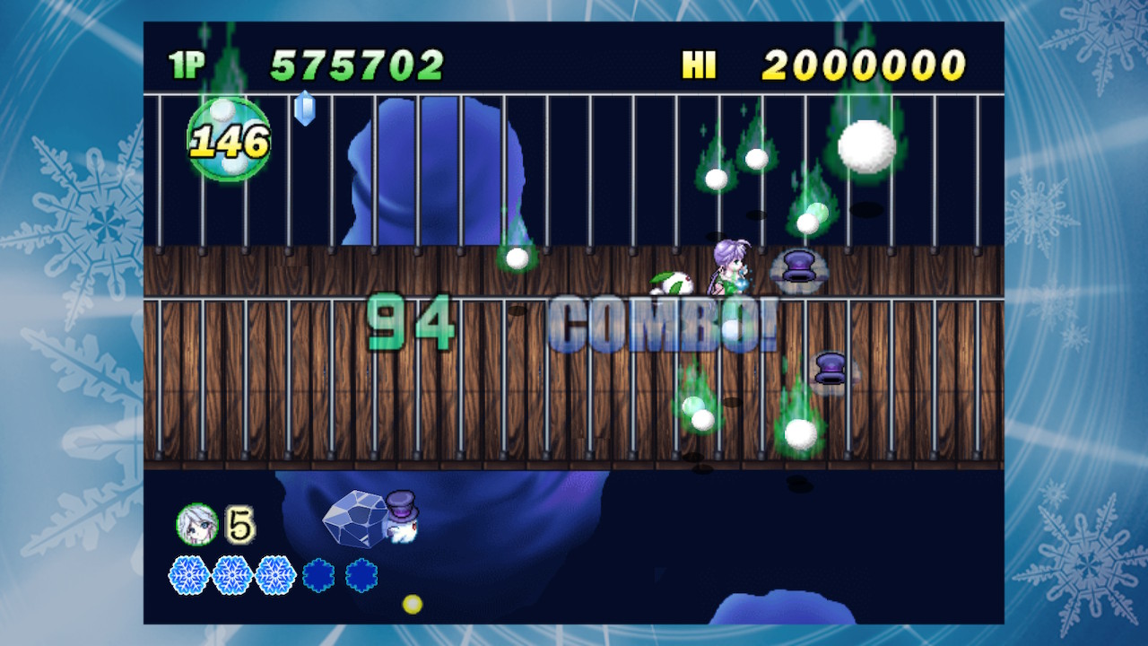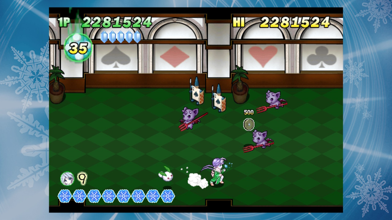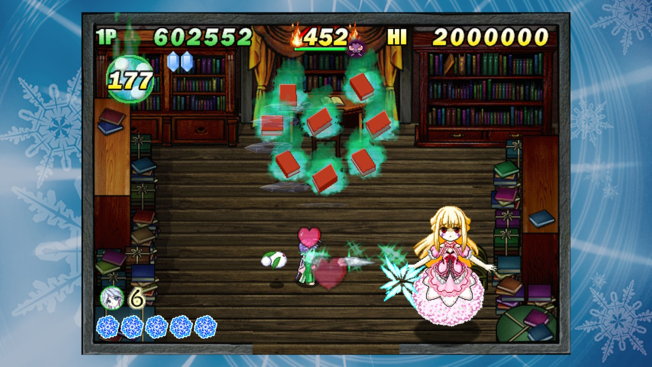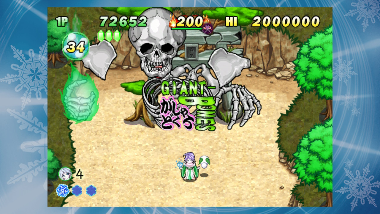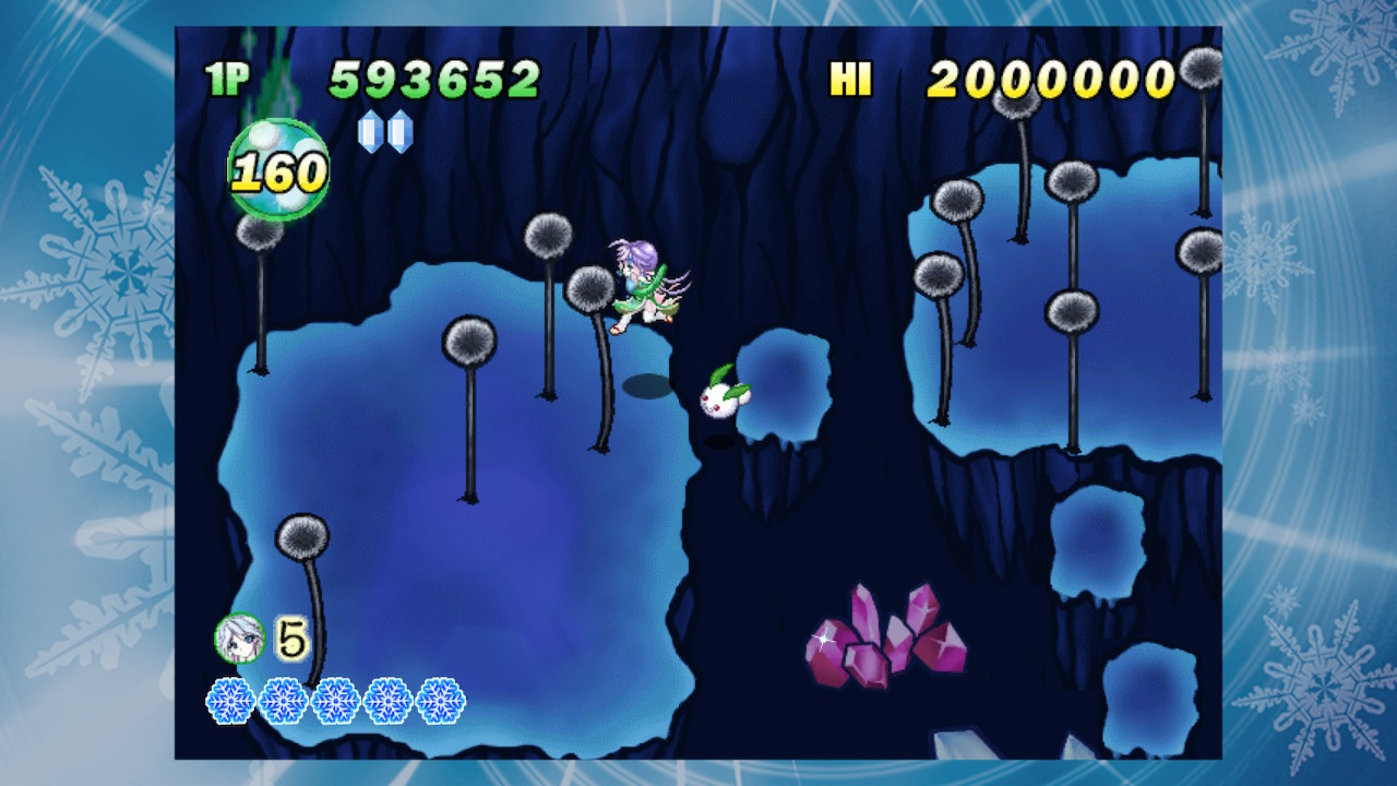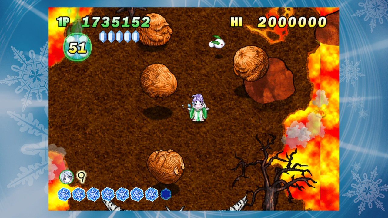 Though Heavenly Guardian remains firmly in run-and-gun territory, it’s a rather different experience compared to Kiki Kaikai. Sayuki has no melee attacks whatsoever and instead relies on snow abilities to keep projectiles and foes at bay. By defeating snowmen or by freezing enemies before you shoot them, you’ll obtain snowballs that can be used for two different attacks. Five snowballs can be spent to create a gust of icy wind that’ll freeze anything caught in it, and 20 snowballs will have Sayuki’s snow rabbit pet Toto home in on enemies and freeze them for her. These abilities can freeze both projectiles and enemies, allowing you to eliminate them easily and earn some snowballs back. Bosses can’t be completely frozen, but using snow abilities on them will slow them down and make them take more damage temporarily. If you can freeze large batches of enemies and/or projectiles and destroy them quickly, you’ll earn a combo for more points and more snowballs. This loop of using your abilities without hesitation to maintain control over your opponents while also keeping your snowballs topped off is the most successful part of Heavenly Guardian as it presents a unique dynamic that encourages resourcefulness over hoarding.