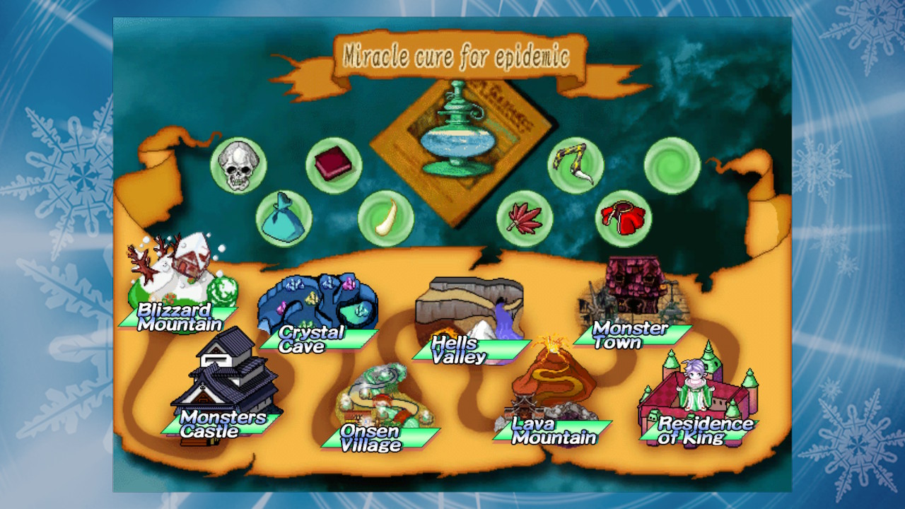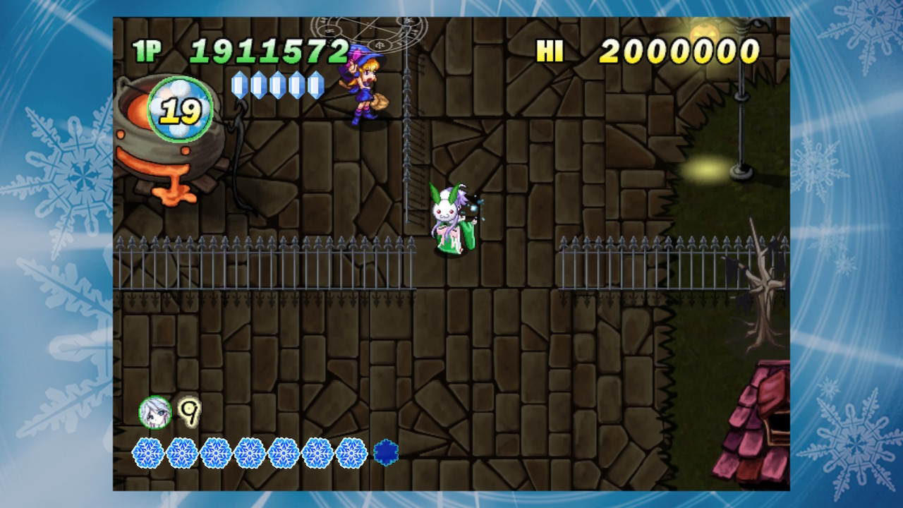 Heavenly Guardian maintains the 2D style of its inspiration, but the execution isn’t nearly as cohesive or charming. Heavenly Guardian combines familiar yuokai with creatures that would fit in with the likes of horror movies, including mummies, witches, and Jack-‘O-Lanterns, and then combines that with seemingly random things like gelatinous cubes, creating an odd mixture that never really fits the initial snowy village theming. The sprites also vary in quality to surprising degrees, with some enemies looking great and others looking like they were drawn for an entirely different game and inserted here. Early screenshots of Kiki Kaikai World looked to have much stronger art design and a stronger focus on the Japanese folklore theme like the previous games, so it’s likely some ideas and designs had to take hits once the initial project was scrapped and the budget was cut.
