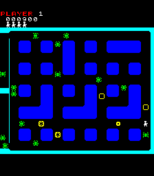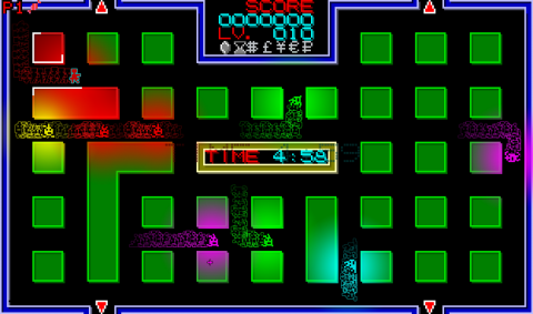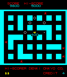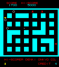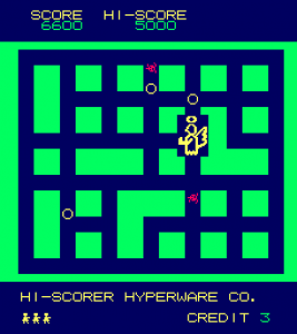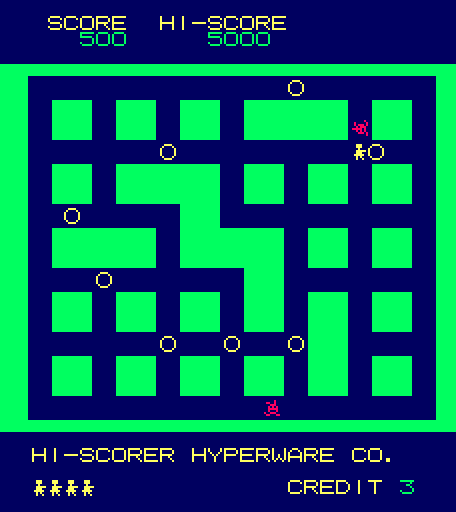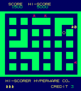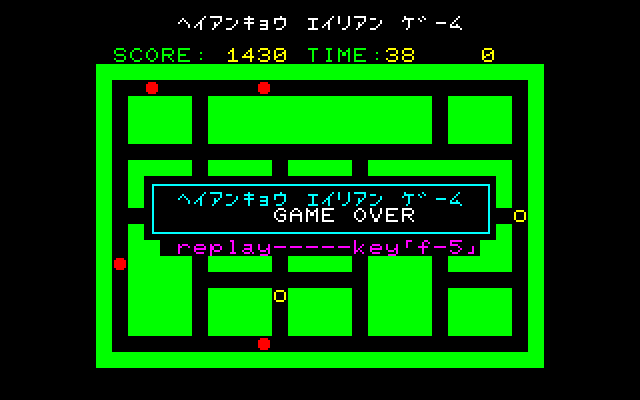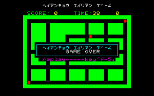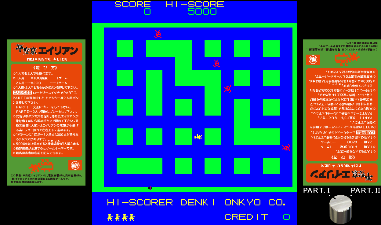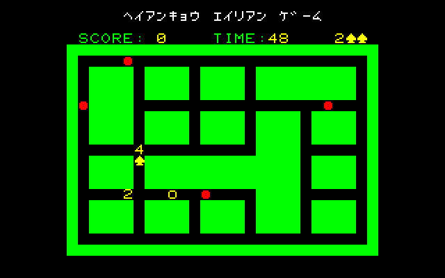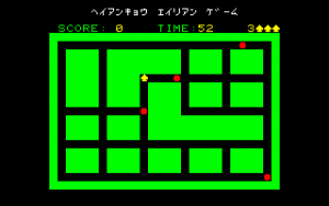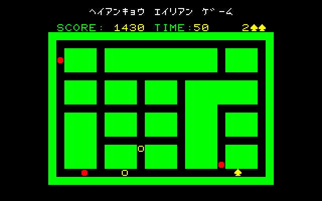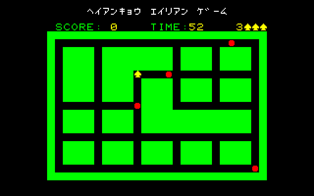 Many iterations of Heiankyo Alien were available in Japan, although none of them are available online and little release information is available. The original PC-8001 game by Tokyo Science Group is markedly different from the arcade game in appearance. The main character looks more like a spade than a human being. Aliens are represented by big red dots and the walls are green instead of blue, but otherwise the core gameplay mechanics are intact. This version was given a more widespread commercial release in June 1981, the only difference being that the walls are now yellow.