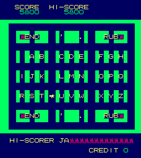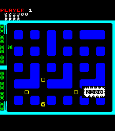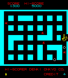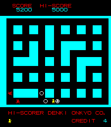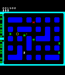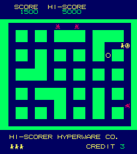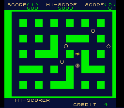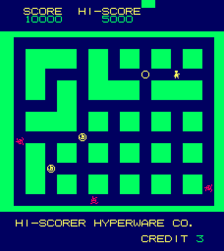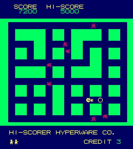 When the game starts, the map is generated and all the enemies are randomly placed on the map. The streets of Heiankyo are similar to most maze chase games, the only difference being that the paths are never symmetrical. Likewise, the aliens move about the screen seemingly at random, sometimes running laps around the entire map, sometimes walking back and forth in the same two step pattern for half a minute. They’re largely unpredictable, and while it’s nice to know that they’re never specifically coming after you, it quickly poses a problem: how are you supposed to capture these aliens when they won’t stay still?