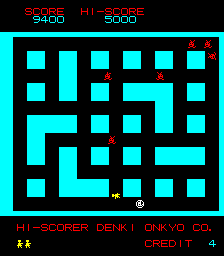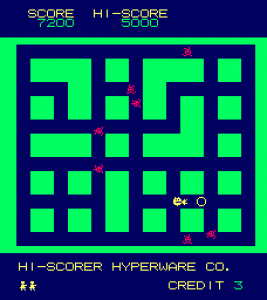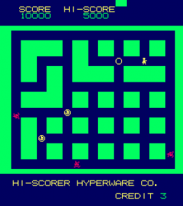 While Taito and Namco’s games were world-wide phenomena, countless other, smaller developers were still pioneering genres. One example was the Theoretical Science Group, a small gathering of programmers at the University of Tokyo. Heiankyo Alien‘s development background, according to the Japanese Wikipedia, is nothing short of amazing: A reporter for a popular column in the Asahi Weekly, so the story goes, came to Tokyo University to report on game projects, but had to find out that no games were being developed there. So a call for game ideas was quickly made on campus, and a student came up with the idea for Heiankyo Alien, which was then included in the Asahi Weekly article without a line of code being written at the time.