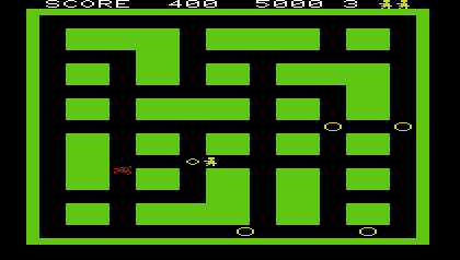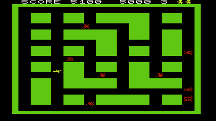 The most massive overhaul is Sega/Gremlin’s Digger, released in 1980. The setting is switched to a giant canyon filled with green insect-like monsters. There is a red insect that, if buried first, will give the player a thousand points. The maze is a dark blue color, the enemies are now green, and the font is the same as Head On‘s, but perhaps the coolest enhancement is how the enemies are kept in a large pen on the left of the screen. Instead of a swarm of enemies randomly appearing at the three minute mark, they now come flooding through the gates, a frightening visual element that trumps the Japanese original. The game has never received a home console port.