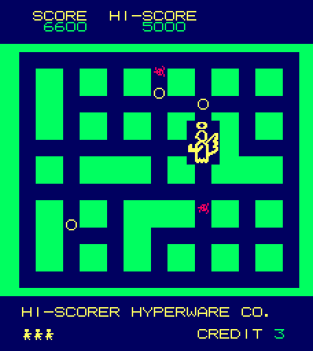 Heiankyo Alien is one of the first games to offer a variety of multiplayer options. Two gamers can either participate cooperatively or competitively. The former allows both players to be on screen at once, digging and filling holes together, while the latter has players take turns. The co-op mode is a lot more interesting, sharing a score and teaming up against the unpredictable aliens. In the very least, it’s exciting that such an early arcade game provides so many options.