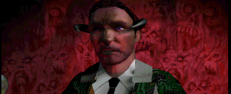 A huge chunk of the game is simply spent listening to conversations. All of the dialogue is accompanied by computer-rendered videos of the character speaking, although it’s just a short animation looped over and over until they finish speaking. Besides the narrator, whose genial tone is tremendously out of place, most of the voice acting is acceptable. The “big name stars”, as listed on the cover, include Dennis Hopper playing the role of a demon mafia lord named Mr. Beautiful; Stephanie Seymour as the hologram of Gideon’s dead ex-girlfriend; and Grace Jones as Solene Solux, the leader of the Hand. Most of the character models have aged badly, although the developers put a lot more effort into Hopper’s and Jones’ characters, making them look as close to the actors as possible. Seymour’s character is pretty curious, considering she’s one of the two live actors in the entire game. Not only is she out of place, but it’s hard to believe that the ex-Victoria’s Secret model could actually be a competent demolitions expert. The other live actor is Geoffrey Holder, who appears in video diary form as a government agent.