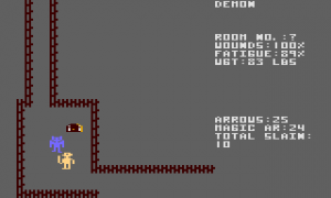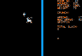 As a direct sequel to Temple of Apshai, Hellfire Warrior assumes players who have mastered the previous game and also bring their high-leveled characters with them. The game goes to great length to explain how the first stage is actually called level 5, not only because it continues after Apshai’s fourth level, but also because it is meant for characters on experience level 5. An ingenius concept, with the sole problem that the game never actually displays a character’s level. Newly created characters, however, begin with a startup boost of 21,000 EXP, so that might serve as a benchmark.