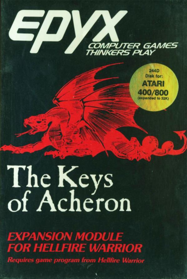 Expansions for Hellfire Warrior were published alongside the Temple of Apshai add-ons. While the engine had experienced several improvements with the newer game, the higher popularity of Apshai probably prevented Automated Simulations from abandoning it altogether, but at least the more obscure Hellfire Warriors was also supported with two sets of maps. The first of these, dubbed Keys of Acheron, was designed by Paul Reiche III, who soon after left the company following Freeman to work with him at Free Fall Associates. Even later he became famous for creating the first two Star Control games.