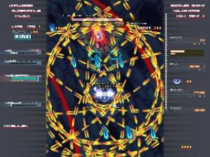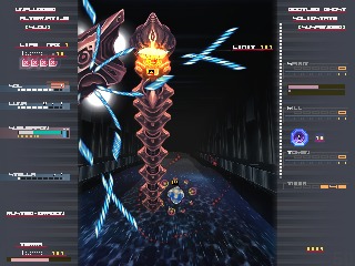 Taking another cue from Radiant Silvergun, Hellsinker puts its character sprites over 3D polygonal backgrounds that twist and turn as you progress through the stages, giving the game an unparalleled among doujin shoot-em-ups sense of depth and immersion. The initial stages’ backgrounds are admittedly pretty dull, what with their murky color pallete and near-constant rainfall, but things get more interesting once you reach the Cardinal Shaft, which is presented in-game as a series of tunnels, halls and shrines that eventually give way to a massive computer matrix, with the absolutely bonkers final boss battle throwing out every graphical effect the game has under its sleeve at you once you reach the top of the tower where the “FATAL ATTRACTION BE DESCRIBED AS ‘Hellsinker‘” resides. While the game’s sprites are small and lacking in detail when taken in on their own, most large enemies and all bosses are composed of several sprites for each separate body part jointed together (again akin to Treasure’s and Raizing’s games), which gives them the extremely fluid animation that is expected from all good modern shoot-em-ups. Every destroyed bit of a boss’ body drop Tokens and counts towards your Kill score, further motivating those who play for score to take their time when battling against the Prayers. The soundtrack, with its surprisingly effective combination of drum-n-bass, trip-hop, hardcore techno and distorted chorus chanting is a perfect match for the game’s bizarreness, especially when considering how enemy movement and bullet patterns is perfectly synced up to it most of the time.