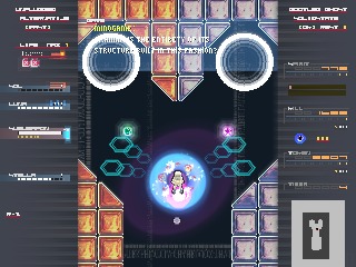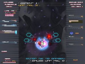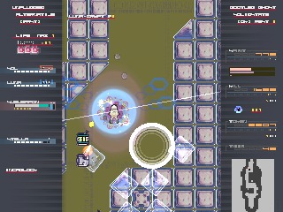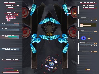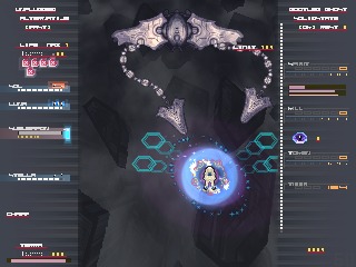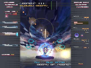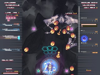 Tying into Hellsinker‘s complex lore is its terminology; the way the game and its supplementary materials refer to typical shoot-em-up elements such as bullets, bombs, powerups, extends, auto-bombing and Rank. Taking a cue from Taoism, Hellsinker takes place in a world governed by two opposing-yet-cooperating fundamental forces, Sol and Luna, which in the game itself serve as indicators for your main and sub-weapon’s power level, respectively. Bullets are highly concentrated bundles of minuscule spirits materialized into physical forms by the characters’ psychic powers, Rank (known here as Stella) is the life force of these spirits, bombs are Discharges of raw psychic power, stages are Segments of the Cardinal Shaft and the areas surrounding it, auto-bombs are Bootleg Ghosts, and so on.