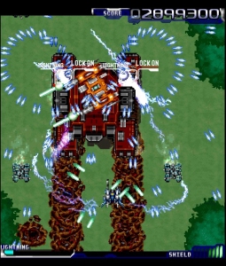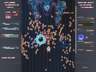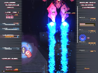 -KOG-0FS “NO CHASER” – Xanthez (Anti-Bacillus Saber): A set whose combination of a powerful, limited-use lock-on weapon and rotating sword attacks a la Radiant Silvergun makes for an interesting playstyle focused almost strictly on close-quarters combat, something which you don’t usually see on most shoot-em-ups. Both its charge shot and Discharge revolve around a brief burst of blue laser beams which does huge damage but doesn’t last very long and which can be used frequently due to its low Sol cost.