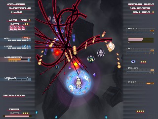 Her playstyle takes after Dodonpachi in that the range and the strength of her main weapon is determined by whether you tap or hold down the fire button; unlike Cave’s seminal franchise, however, holding down the button sacrifices power for a wider shot, while continually tapping it does the opposite. She has a bullet-cancelling homing shot as her secondary weapon, and can shoot in any direction and through enemy barriers with the help of her Misteltoe companion Saraba-Maru, who can summon a Terra Diver-esque area control field and/or controlled like a 360-degree turret with the Speed Change button. She, unlike other characters in the game, has two Discharges: Curtain Riser is a Raiden/Truxton-style bomb which can be aimed by holding the Discharge button down, while Bacillus Cloak (triggered by using a Discharge right after firing a barrage of normal shots) grants her an extended period of invulnerability in exchange for no other effects. All this versatility makes her the preferred character among superplayers and score chasers, even though Deadliar is the closest thing HELLSINKER has to a main protagonist.