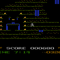 The ColecoVision (and identical MSX) port gets rid of the segmented graphics for more natural looking caves, and even adds some grain and stalactites in the background, but in some color variants enemies can be hard to make out in front of them. The Commodore 64 version is based on the same template, and its less saturated color palette compared to the ColecoVision (at least in emulators) suits them much better. The Apple II version, programmed by Microsmiths, is closer to the original, but has particularly hideous wall textures. But the only version that manages to look worse than the original is the ZX Spectrum port, whose most laughable feat is displaying the Activision logo rainbow in only two colors.