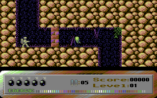 On paper, Dark Caves sounds like the ultimate fodder for fans of the original. Unfortunately, the level design isn’t very good. The first few caves are devoid of any challenge and thus boring. Afterwards the game gets hard quickly, but difficulty is achieved mostly through cheap tricks. The most common trick to kill the player is simply incoherent stage layout – quite often the hero walks on solid ground out of one screen, only to find himself immediately above deadly acid in the next. There are also some very annoying screens where the background looks almost the same as the wall, and at some points the level loops over and over again until the player finds the nigh invisible passage. Other than the original, where it was possible to get through all mandatory walls by detonating them, here it’s often required to slowly and tediously blast them down with the laser.