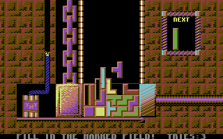 Dark Caves is even shorter than H.E.R.O.. It has only 18 “proper” stages, After which follows a weird Tetris challenge to defuse a bomb – instead of clearing rows, the goal is to fill a rectangle area at the bottom entirely with blocks. Needless to say, there isn’t much substance to this, and afterwards the game is over immediately.