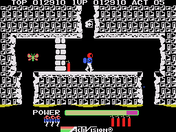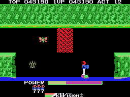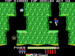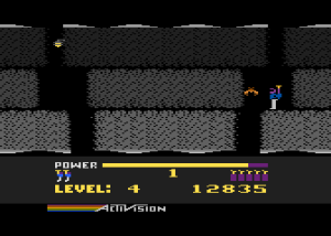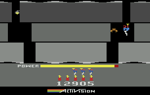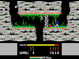 The propeller isn’t the only tool the hero has at his disposal. From the very beginning, thin walls often block the way and have to be blown away with dynamite. The supplies are strictly limited, and from about halfway through all the stages are designed for perfectly efficient dynamite use. When running out of explosives, it’s still possible to shoot down the wall with a head-mounted laser gun, but may take more time than Roderick has – a power bar is constantly depleting, and when it runs out, the hero dies. The primary use for the laser is thus to fend off the various creatures of the deep, mostly spiders, moths, snakes and bats. Neither of them is particularly active, but placed in a way that makes it often impossible to avoid confrontation.