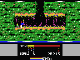 The ColecoVision (and identical MSX) port gets rid of the segmented graphics for more natural looking caves, and even adds some grain and stalactites in the background, but in some color variants enemies can be hard to make out in front of them. The Commodore 64 version is based on the same template, and its less saturated color palette compared to the ColecoVision (at least in emulators) suits them much better. The Apple II version, programmed by Microsmiths, is closer to the original, but has particularly hideous wall textures. But the only version that manages to look worse than the original is the ZX Spectrum port, whose most laughable feat is displaying the Activision logo rainbow in only two colors.