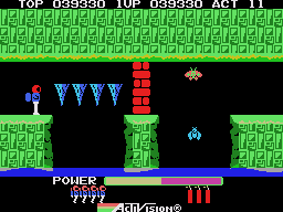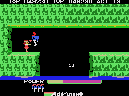 Aside from the cosmetic changes, however, H.E.R.O. is essentially the same game on each platform. The same cannot be said of the SG-1000 version, programmed by Sega. Not only does it replace the propeller with a much cooler jetpack, it also introduces a number of new elements to the mix. Most of them are traps, ranging from crushing walls to lava spurts springing from the ground. Most annoying are the falling stalactites, not least because they completely break one particular level, where it seems impossible to get past them without a thousand tries and a big portion of luck to counter the glitch with another glitch. By the end the game also starts to look really monotonous, because all the walls in all stages are the same green tone (albeit with somewhat different rock patterns). On the other hand, it does have a few added nice touches, like turtles replacing the rafts. The hero still mainly saves miners, but there are also a few girls that hand him hearts when rescued.