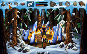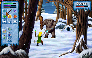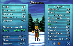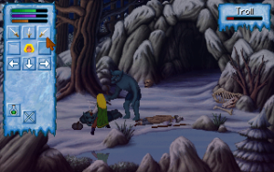 With Heroine’s Quest’s frigid setting comes survival gameplay that is, once again, more advanced than Quest for Glory’s relatively simple “run out of stamina and you die” mechanic. The first day of the game requires the heroine to venture beyond the city of Fornsigtuna to forage for food and a freezing meter appears in the upper left hand side of the screen, indicating the very real chance that she’ll turn into an icicle if she goes too far. Depending on your character class, you’ll have to turn to warm clothes or fire magic to traverse the wilderness, and the first few days of Heroine’s Quest feel more akin to The Long Dark than Quest for Glory. Some might find the challenge frustrating, but there’s no denying the feeling of accomplishment at seeing your heroine dashing across frigid Jarnvidr with nary a care in the finale, while she could barely leave the city gates in the beginning.