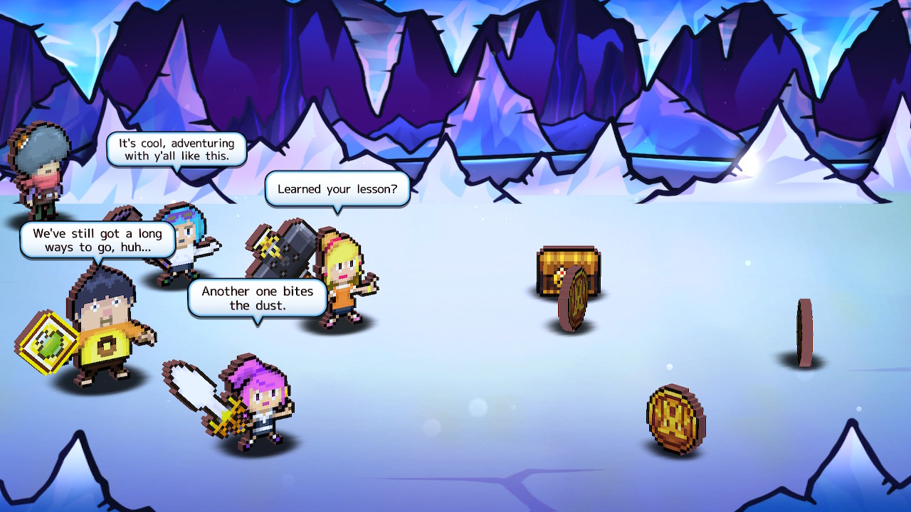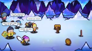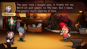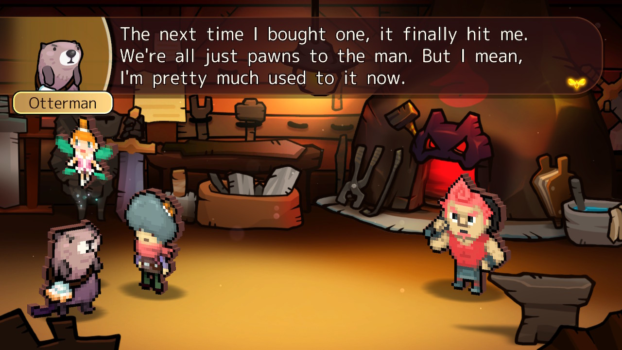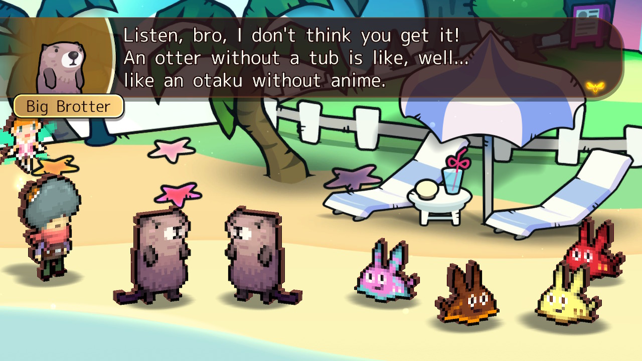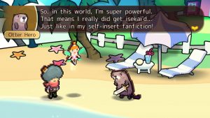 Humor in Heroland relies on repeated gags, pop culture references, and a heavy dose of memes. During dungeons and cutscenes, characters will take the time to crack jokes, reference things that are chronologically impossible (the game takes place during the 14th century, yet things like Final Fantasy and Keanu Reeves’s appearance at E3 2019 are referenced), and have bizarre conversations like debating the best way to drink milk. Even NPCs get their time to shine, with the funniest example being an otter who’s convinced he’s the protagonist of an Isekai anime after getting hit by a truck that somehow transported him from Voorhees, New Jersey to Heroland.