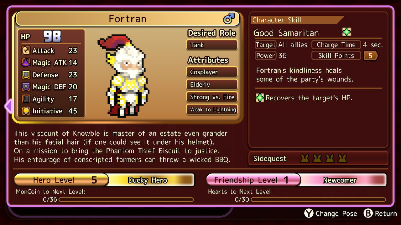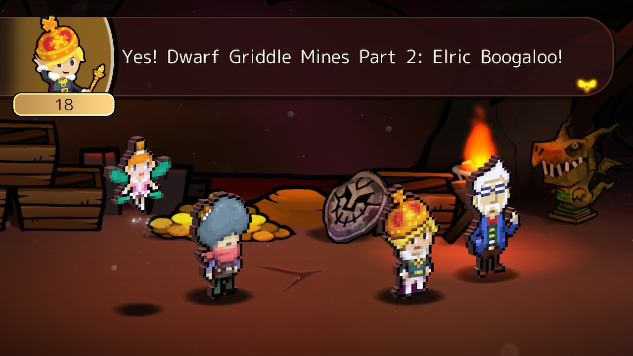 A prince from the Knowble Kingdom and 18th in line to the throne (hence his nickname of “18”). He comes to Heroland in order to slay the Dark Lord, which he thinks will make him next in line to the throne. For much of the game he’s a cocky brat, but he changes greatly as he bonds with Lucky and certain events make him question his beliefs.