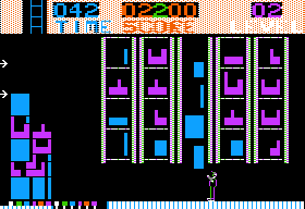 At least the building blocks come quite visible from five chutes, which offer a wide range of choice and a reasonable peek into the future, as the next four blocks from each chute are always on screen. The player has to grab these blocks and place them on a set of springs to the left. The building area and springboard are six units wide each, and it’s possible to place more than one block at once before catapulting them onto the empty field to the far left, where they always appear in perfect order as they were placed on the bumpers.