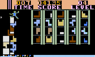 Like most early puzzle video games (aside from those that were adaptions of traditional puzzles) such as Sokoban, Atari Video Cube or Burger Time, Highrise relies on a realized player avatar to communicate its concept. Here it’s Barnaby, the master builder, who has to build towers that can support him to climb up to a ladder at the top of the screen, which takes him to the next stage. Even though the game’s marketing tried to push the “urban” appeal in reference to modern cityscapes borrowed from the punny title, what Barnaby is building does in no way have to resemble a building someone could actually live in. It’s merely for the purpose of gettin up, and it’s all kept very abstract. Where is Barnaby going? What purpose does his journey upwards have? Where are the building blocks coming from? None of these questions are ever a concern.